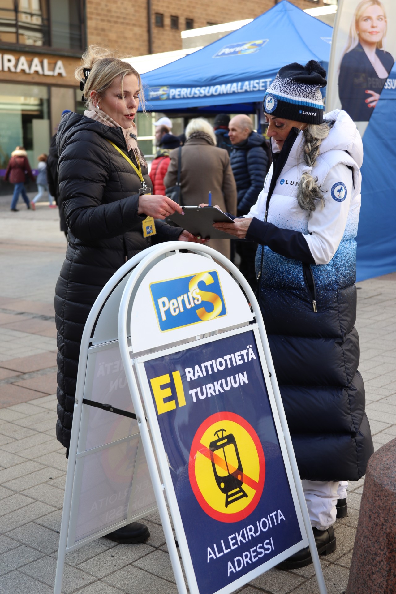 Sunnuntaina taasen Turun perussuomalaiset vietti naistenpäivää Yliopiston kävelykadulla ja aloittivat nimien keräämisen raitiotien vastaiseen adressiin. Kahden tunnin tapahtumassa kerättiin yli 200 nimeä ja kerääminen jatkuu seuraavaksi Suurmarkkinoilla. Adressin voi myös allekirjoittaa verkossa.